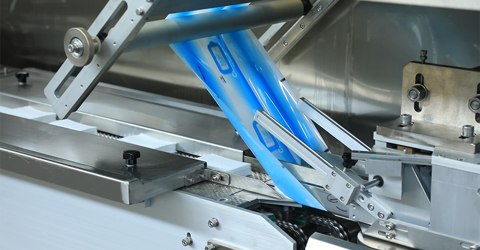 工作流程:雙卷無紡布?xì)鉂q軸放卷(自動(dòng)換接料)→自動(dòng)張力控制→自動(dòng)糾偏→縱向折疊→在線自動(dòng)加液→ 牽引輸送→ 定長裁斷→ 計(jì)數(shù)堆碼→成品輸送→ 集料裝置→ 定位輸送→ 包裝膜自動(dòng)沖孔貼標(biāo)(雙貼標(biāo)不停機(jī)自動(dòng)換標(biāo))→可調(diào)式自動(dòng)成型制袋→ 縱封 →橫封 →成品輸出。